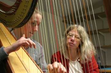 Learn to Play the HarpJenny has several years teaching experience, both privately and at various schools. Her pupils have a good success rate in Associated Board exams (currently 85% Distinctions) and many have given public performances of a high standard. As well as teaching in schools, Jenny teaches from home and is ready to teach young and old! Lessons are usually at Jenny’s house in Newbury and last 45 minutes to an hour. Clarsachs cost about £1000 or more new. Pedal harps can cost anything from £5000 to £30,000. Secondhand harps are available. It is best to hire a harp at first and learn to play something before making such a major purchase. Harps can be hired from From time to time, it will be necessary to replace strings on the harp. The highest strings cost about £5 and the bass strings can cost up to £20 each. A full set of strings can cost £200 to £400 You can begin to learn the harp at almost any age. The most important thing is enthusiasm to learn. Very small hands may not reach everything. It is probably better not to start younger than 7. Old hands may be stiff and one should be aware that playing the harp is a muscular business, needing flexibility in the fingers and thumbs, nevertheless enthusiasm can overcome stiffness! Your first harp lessonThe first lesson is about learning a good playing action and position and concentrates on exercises to practise this. Later on the lesson will normally cover an exercise, a study and two pieces as well as practising sight-reading and aural as appropriate. Good progress depends on regular practice, preferably every day. About half an hour a day is good for the early stages. More advanced players will need more time. Exams are set by the Associated Board and by Trinity College of Music at Grades I to VIII. More advanced exams are also available. Where to play once you have learntOrchestral playing is not easy and one needs a standard of probably Grade VI or so, but youth orchestras are generally short of harpists as are most amateur orchestras. There is chamber music for harp though the famous music is difficult for all players. There are competitive festivals with harp classes, particularly around London. |