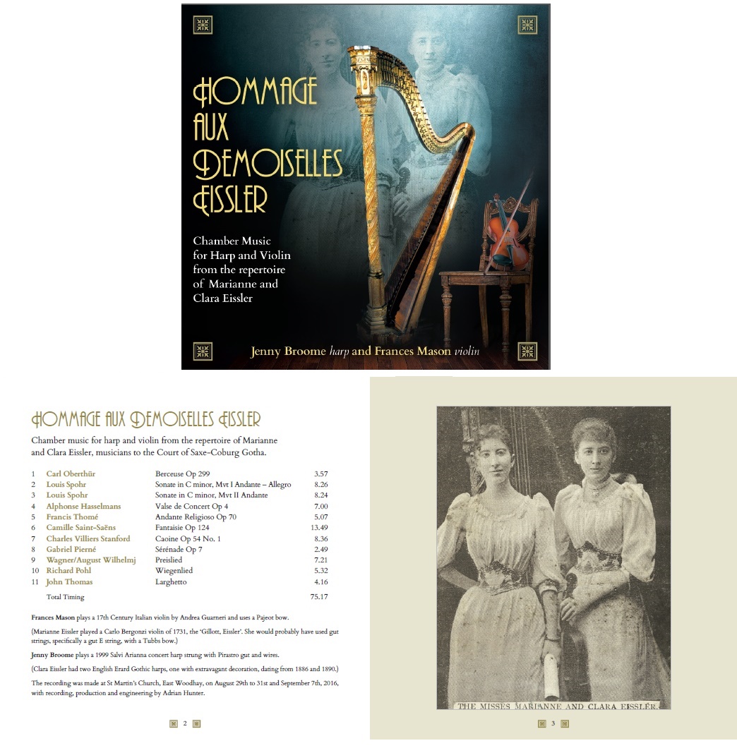 'Hommage aux Demoiselles Eissler' explores the background to the composition of the Fantaisie, with works by Spohr, Pierné, Oberthür, Thomas, Hasselmans, Thomé, Stanford and Wagner/Wilhelmj, making a sound picture of the Belle Epoque salon, and the extensive programme notes throw more light on the career of the Eissler sisters.